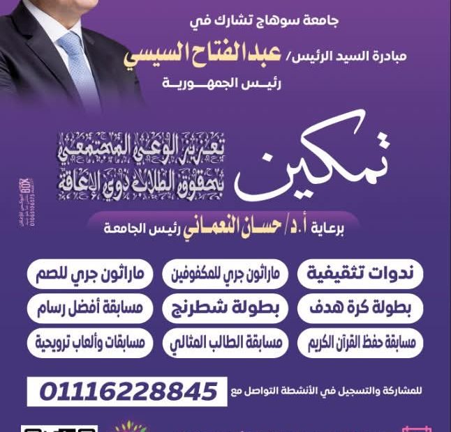 مبادرة تمكين لدعم الطلاب ذوي الإعاقة بالجامعات المصرية جامعة سوهاج بيئة جامعية مستدامة وميسرة وأكثر شمولا للدمج والتمكين بشتي أنواعه للطلاب ذوي الإعاقة؛ والجاهزية المؤسسية لتنفيذ أنشطة مبادرة تمكين تحت رعاية فخامة الرئيس عبد الفتاح السيسي – رئيس الجمهورية وتوجيهات… اقرأ المزيد »مبادرة تمكين لدعم الطلاب ذوي الإعاقة بالجامعات المصرية