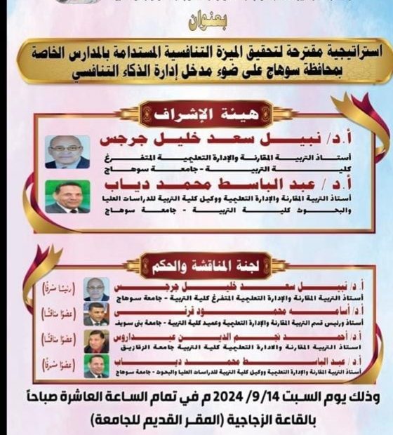 دعوة لمناقشة رسالة الدكتوراه بقسم الإدارة التعليمية للباحثة/ كارولين ثروت حليم وذلك يوم السبت الموافق ١٤ سبتمبر ٢٠٢٤م