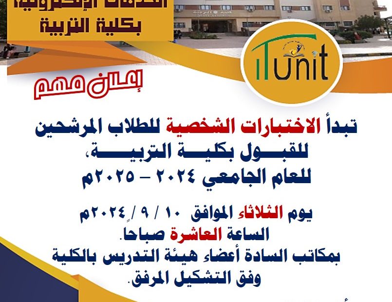 موعد بدء الاختبارات الشخصية للطلاب المرشحين للقبول بكلية التربية للعام الجامعي 2024-2025م ستبدأ بمشيئة الله تعالي الاختبارات الشخصية يوم الثلاثاء الموافق 10 سبتمبر 2024م ومرفق في الملف التالي تشكيل لجان الاختبارات الشخصية: تشكيل الاختبارات الشخصية مرحلة الليسانس والبكالويوس 2024-2025م