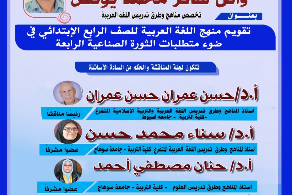 دعوة لمناقشة رسالة الماجستير تخصص المناهج وطرق التدريس اللغة العربية للباحث/ وائل شاكر محمد يوم الاثنين الموافق 9 سبتمبر 2024م