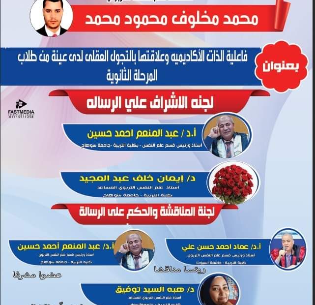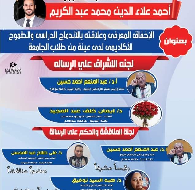 دعوة لمناقشة رسالة الماجستير في التربية تخصص علم النفس التربوي المقدمة من الباحث/ أحمد علاء الدين محمد عبدالكريم