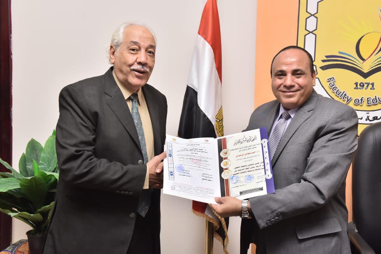 In the presence of Prof/ Faisal Al-Rawi, Professor of pedagogy and former Dean of the Faculty of Education, Sohag University, Prof/ Emad Samuel, Professor of pedagogy and Vice-Dean for Community Affairs, and Dr/Mustafa Fahmy, the Academic Coordinator of the College and Director of the Scientific Publishing Unit.